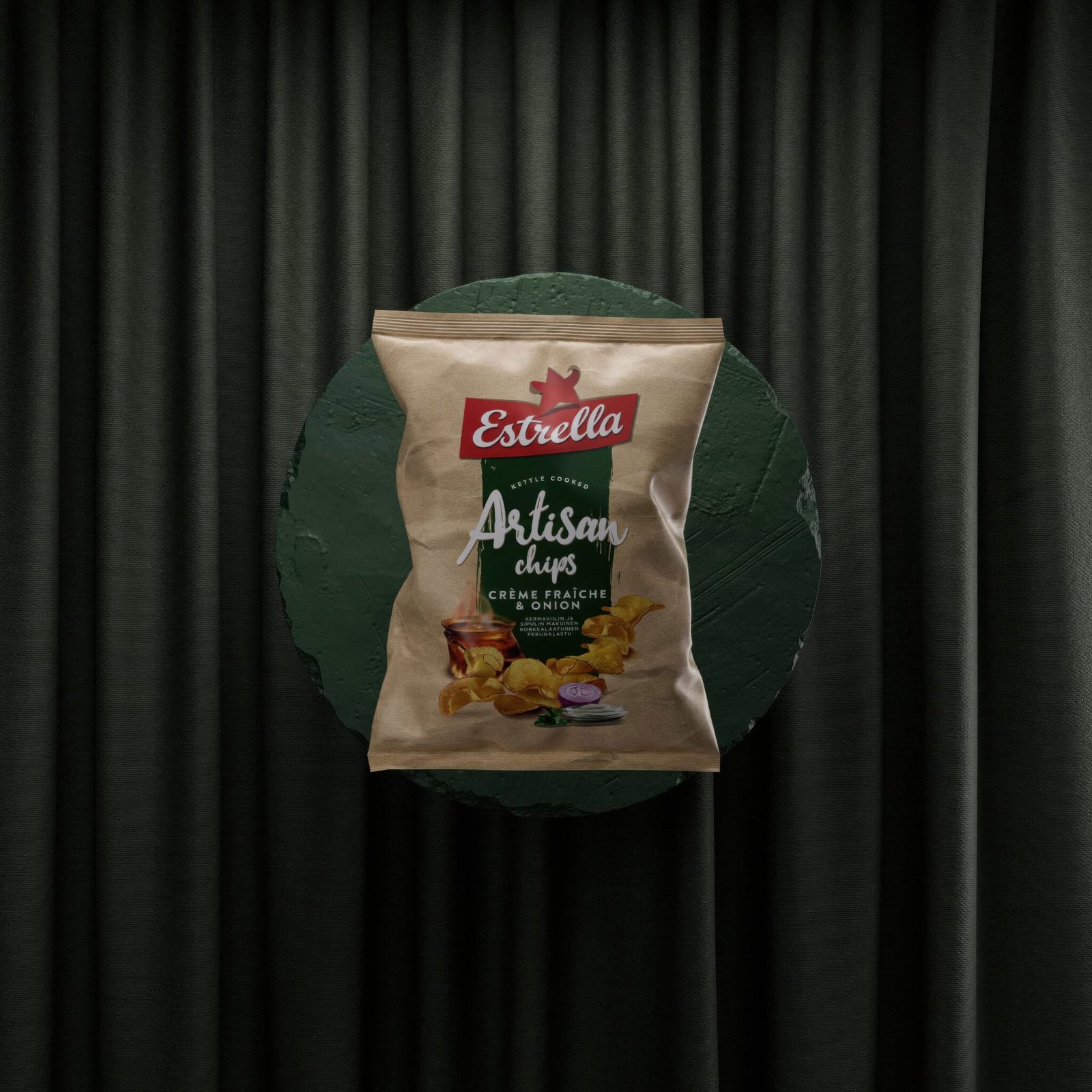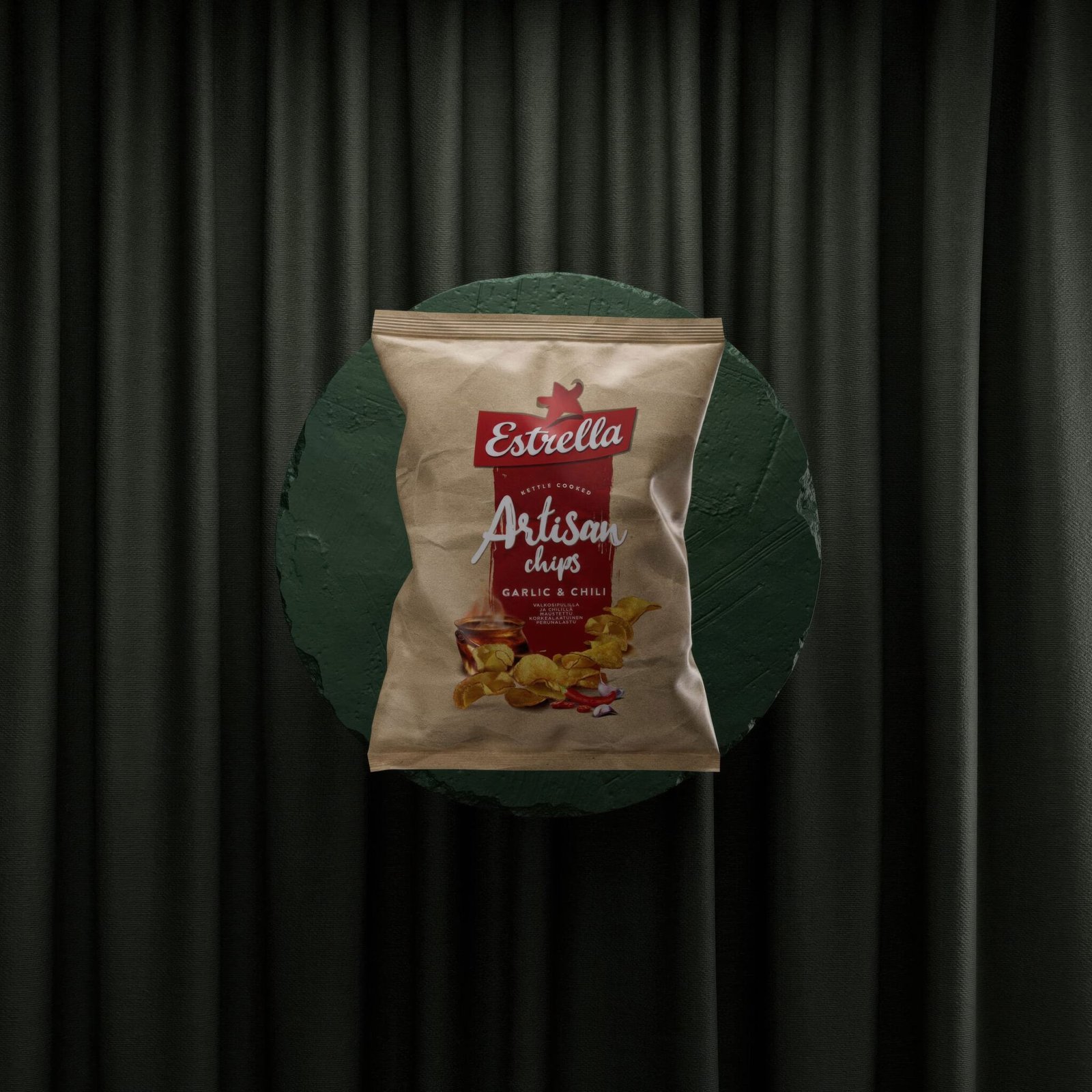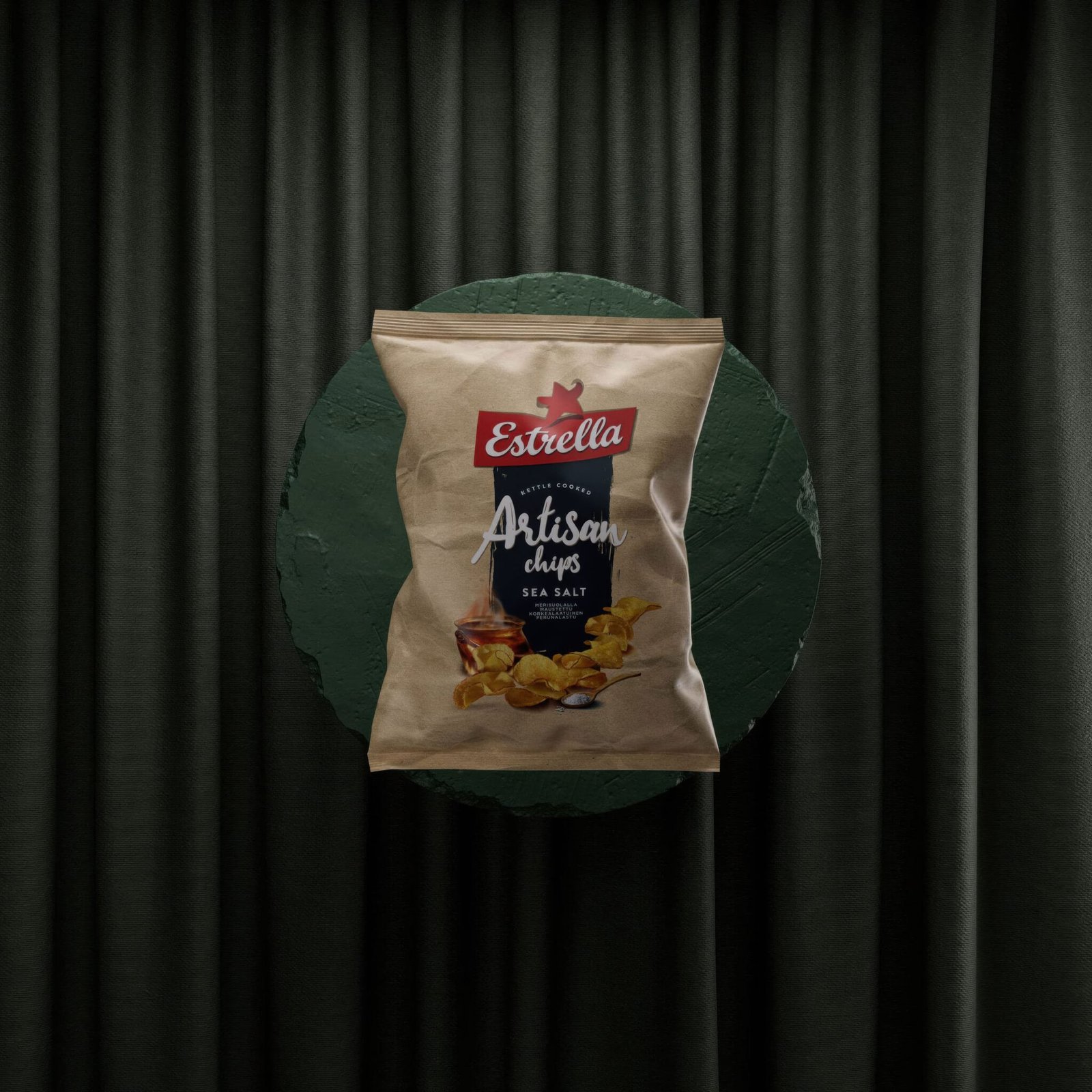 For Estrella’s Artisan Chips range, the focus was on highlighting the premium, kettle-cooked nature of these snacks. The design emphasizes rustic sophistication with earthy tones, textured packaging, and natural imagery, reflecting the artisanal quality and flavors. Each variant—Crème Fraîche & Onion, Garlic & Chili, and Sea Salt—evokes a sense of indulgence and gourmet appeal, targeting discerning snack lovers.